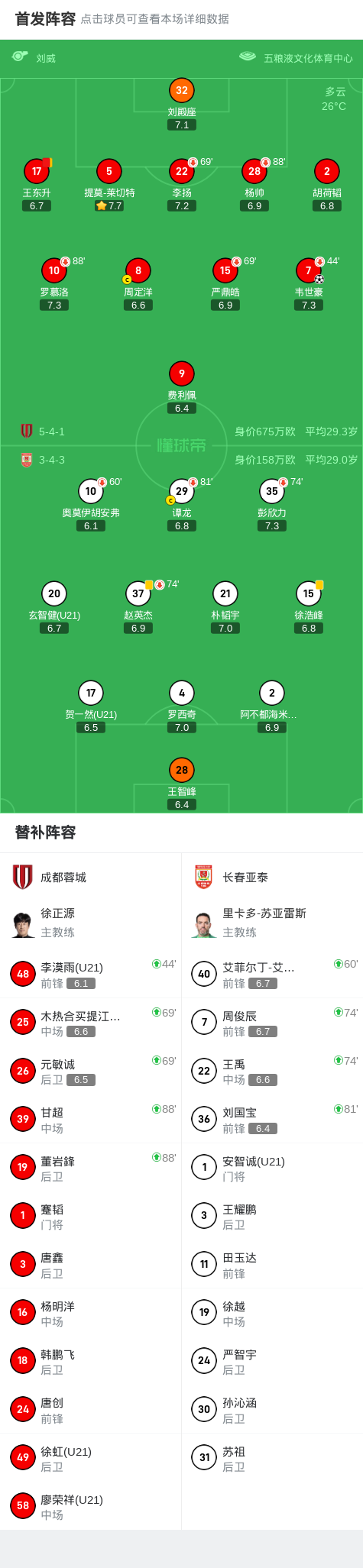 北京时间9月12日19:35,中超第24轮展开争夺,成都蓉城坐镇主场五粮液文化体育中心专业足球场迎战长春亚泰,本场主裁判为刘威,VAR裁判为刘钊。上半场,韦世豪任意球直接破门闪击后在第44分钟伤退。下半场,成都屡失良机,王东升累计两黄被罚下。最终,成都主场1-0小胜亚泰,联赛继续领跑。关键事件第4分钟,韦世豪开出任意球,皮球弹地后直接入网,成都梦幻开局1-0...
