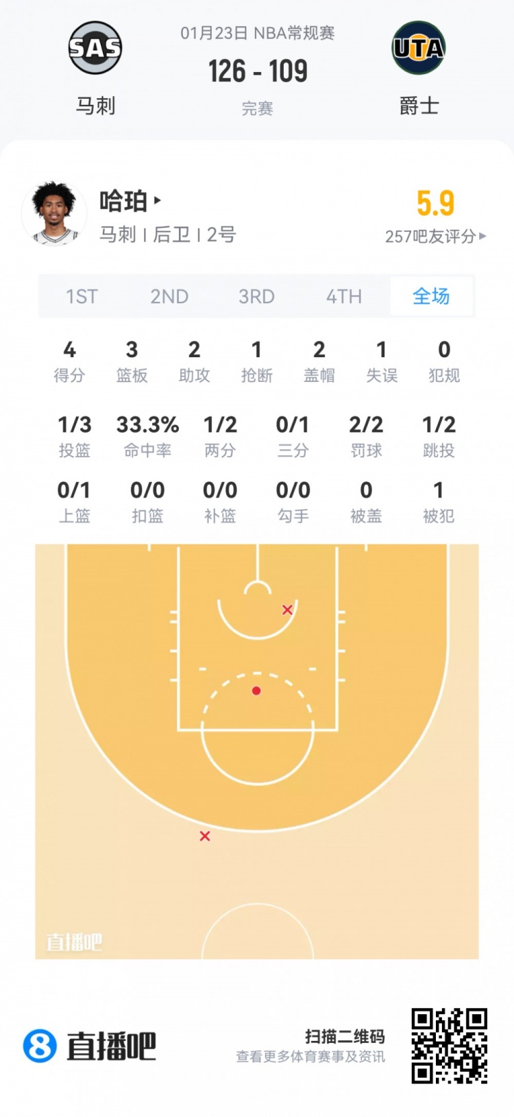 马刺榜眼秀哈珀 登场13.4分钟
